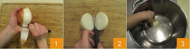 Para preparar o risoto de cítricos, comece preparando o caldo. Descasque a cebola 1 e corte-a ao meio 2. Coloque-a no fogo em uma panela bastante grande com o corte voltado para baixo 3.