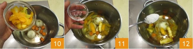 as cascas de laranja e de limão 10. Adicione também os grãos de pimenta preta 11 e uma colher de sopa de sal grosso 12.