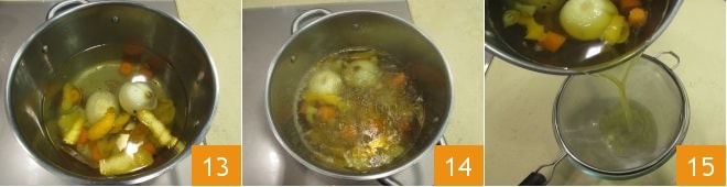 Leve para ferver 13 e deixe cozinhar por cerca de uma hora 14. Em seguida, coe tudo 15 e mantenha o caldo aquecido.