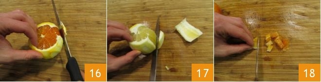 Nesse ponto, pegue novamente o limão e a laranja de que você retirou a casca e descasque-os inteiramente (16-17), tomando cuidado para eliminar completamente a parte branca. Então corte a laranja primeiro em fatias e depois em cubos, tentando não perder os sucos 18.