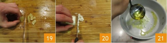 Repita a mesma operação para o limão, de modo a obter cubos do mesmo tamanho. Pique finamente a cebola 19 e deixe-a dourar em uma panela junto com o óleo, adicionando uma concha de caldo para deixá-la refogar suavemente 21.