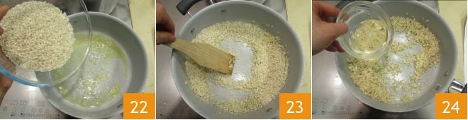 Somente quando o caldo evaporar e a cebola estiver bem murcha, adicione o arroz 22. Toste-o em fogo médio-baixo por cerca de 2 minutos, mexendo frequentemente 23, depois adicione o vinho branco 24.