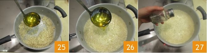 Assim que o álcool evaporar, despeje uma concha de caldo 25 e continue cozinhando por cerca de 15-18 minutos, adicionando mais conforme necessário 26 e mexendo. Para os tempos de cozimento, recomendamos seguir as instruções na embalagem do risoto. Quando faltarem 2-3 minutos e o arroz estiver quase cozido, ajuste o sal e a pimenta 27.