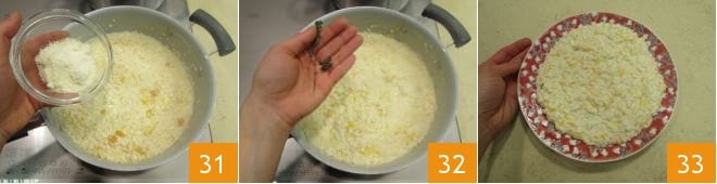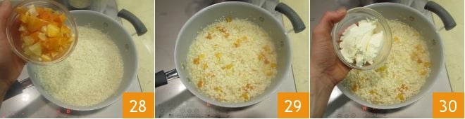 Adicione também os cubos de cítricos 28 e mexa para misturar tudo 29; não se preocupe se os cubos de cítricos não permanecerem intactos e se desintegrarem ligeiramente. Assim que estiver perfeitamente cozido, desligue o fogo e adicione o mascarpone 30.