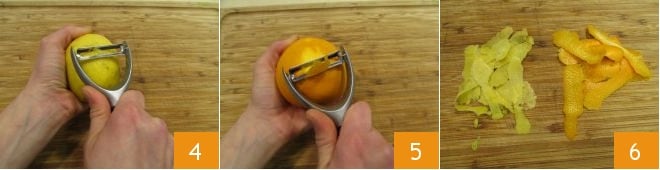 Enquanto isso, usando um descascador de batatas, retire a casca da laranja 4 e do limão 5, certificando-se de não retirar a parte branca, que seria amarga. Tente obter pedaços de casca bastante grandes 6.