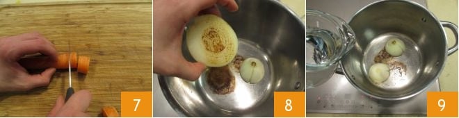 Passe para a cenoura, corte-a em pedaços sem descascar, mas garantindo que esteja bem lavada 7. Assim que a cebola estiver bem dourada 8, adicione na mesma panela a água 9, as cenouras