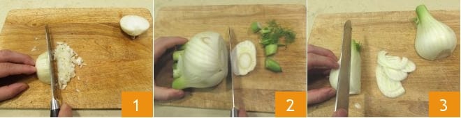 Para preparar o risoto de erva-doce, prepare primeiro o Caldo de legumes e mantenha-o aquecido. Em seguida, descasque a cebola e pique-a finamente 1. Limpe as ervas-doces removendo a base, os talos 2 e as camadas externas caso estejam danificadas: você precisará obter 320 g de erva-doce para a receita. Lave-as, corte-as ao meio e fatie finamente 3.