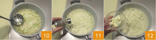antes de adicionar a primeira concha de caldo 10. À medida que o caldo for absorvido, adicione mais, continuando assim até que o arroz esteja cozido (o tempo pode variar dependendo do arroz utilizado, mas levará cerca de 15-20 minutos). Nos últimos minutos de cozimento, ajuste o sal e a pimenta 11. Quando o arroz atingir o ponto certo de cocção, desligue o fogo e misture com 30 g de manteiga 12
