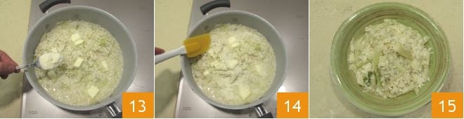 e tempere com o queijo 13. Misture bem 14 e deixe repousar por 1 minuto antes de servir: o seu risoto de erva-doce...perdão, risi coi fenoci está servido 15!