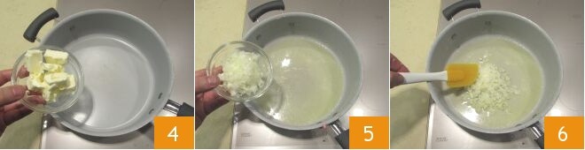 Coloque então a manteiga em uma panela de fundo grosso em fogo baixo 4; assim que a manteiga derreter, adicione a cebola picada 5 e refogue-a, sempre em fogo baixo, por alguns minutos 6 para que murche sem dourar.
