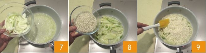 Adicione agora as ervas-doces fatiadas 7, aumente um pouco o fogo e deixe-as cozinhar por cerca de 5 minutos, mexendo para uniformizar o cozimento. Adicione o arroz 8 e, sempre mexendo, deixe-o ganhar sabor por 3-4 minutos 9