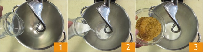 Para preparar os cinnamon rolls com fermento natural, despeje a água 1, o leite 2 e o açúcar mascavo na tigela de uma batedeira planetária 3.