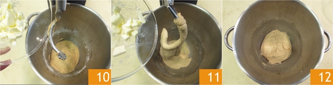 Após esse tempo, adicione a manteiga amolecida 10 em 2 partes 11 e continue a amassar com a batedeira em velocidade média e depois rápida. Quando a manteiga estiver bem incorporada 12, deixe a massa descansar por uma hora em temperatura ambiente.