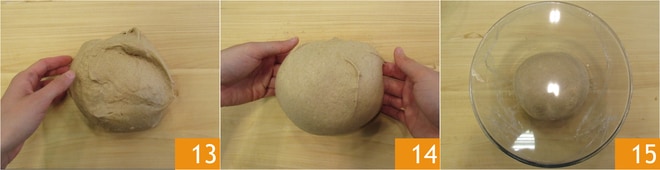 Após uma hora, transfira a massa para a superfície de trabalho e faça dobras slap and fold para dar força e torná-la mais compacta: você deve levantá-la e batê-la levemente na bancada, trazendo uma parte para frente e dobrando-a sobre si mesma 13. Quando a massa estiver bem lisa e firme 14, transfira-a para uma tigela untada com óleo, cubra com filme plástico e deixe fermentar na geladeira por cerca de 10-12 horas 15.