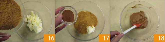 Quase no final do tempo de fermentação, prepare o recheio: despeje em uma tigela a manteiga amolecida e o açúcar demerara 16, depois adicione a canela 17 e misture com uma espátula para incorporar bem os ingredientes 18.