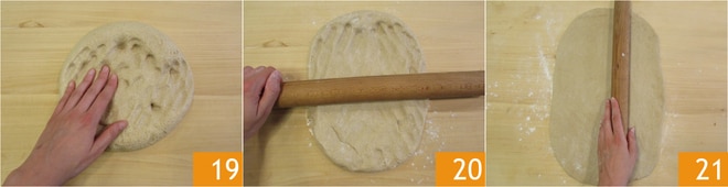 Neste ponto, pegue a massa e comece a abri-la com as mãos 19, depois polvilhe com um pouco de farinha e estenda com o rolo 20 para formar um retângulo de 35x40 cm 21.