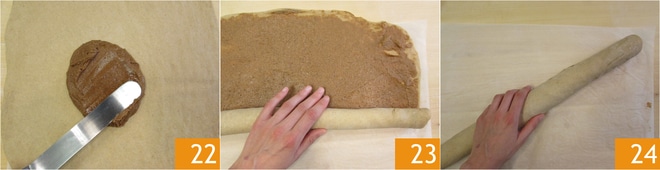 Espalhe dois terços do recheio sobre toda a superfície do retângulo 22, depois enrole-o bem apertado pelo lado mais comprido 23. Envolva o rolo em papel manteiga 24 e deixe firmar na geladeira sobre uma bandeja por uma hora.