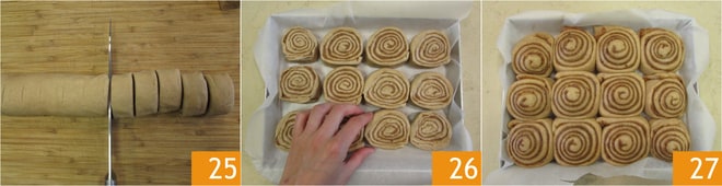 Após este tempo, corte o rolo em 12 pedaços de mesma largura 25. Coloque os rolinhos obtidos em uma assadeira forrada com papel manteiga 26 e deixe fermentar em temperatura ambiente por 2 horas. Depois de fermentados 27, asse os cinnamon rolls em forno ventilado a 200° por 20 minutos.