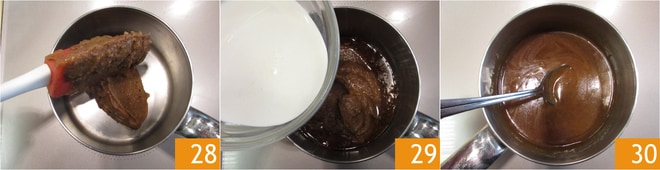 Enquanto isso, prepare a cobertura: despeje o recheio restante em uma panela 28, adicione o creme de leite 29 e leve para ferver, mexendo bem para dissolver o açúcar 30.