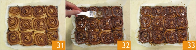 Quando os cinnamon rolls estiverem assados, retire do forno e deixe esfriar 31, depois pincele-os generosamente com a cobertura 32. Seus cinnamon rolls estão prontos para serem saboreados 33!