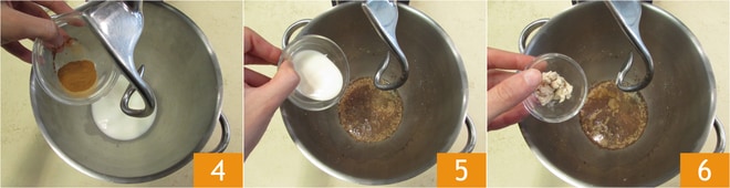 Adicione também a canela 4 e ligue a batedeira com o gancho para misturar tudo, depois adicione o fermento natural líquido 5 e o fermento fresco 6.