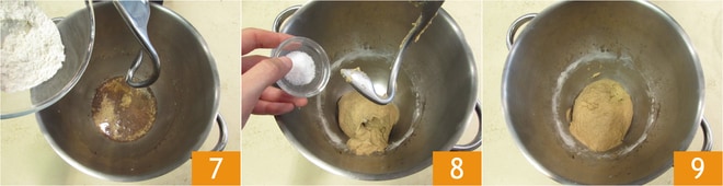 Adicione também as farinhas 7 e ligue novamente em velocidade média. Por fim, adicione o sal 8 e misture novamente até obter uma massa homogênea 9. Deixe a massa descansar na tigela por 30 minutos, sem cobri-la.