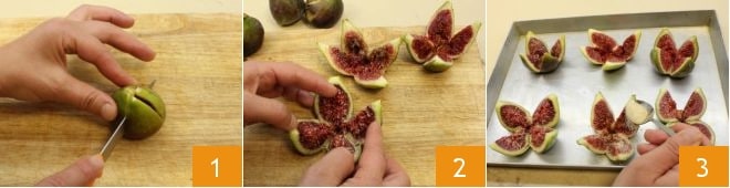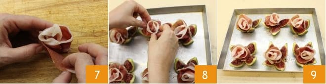 criando assim as rosinhas 7. Coloque cada rosinha no centro de cada figo (8-9) e sirva imediatamente este delicioso antepasto!