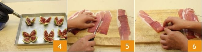 em seguida, coloque os figos assim abertos em uma assadeira e caramelize a superfície por poucos instantes com um maçarico 4 (se não tiver um maçarico, você pode colocá-los sob o grill do forno por alguns minutos até que o açúcar derreta). Enquanto isso, pegue as fatias de presunto que não devem ser muito finas, caso contrário, não conseguirá criar as rosinhas. Divida cada fatia em duas partes iguais 5 e depois enrole cada metade em si mesma 6