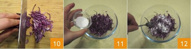 Enquanto isso, cuide do repolho roxo: corte-o finamente 10, transfira para uma tigela e adicione o sal 11. Misture com um garfo 12, espere 15-20 minutos,