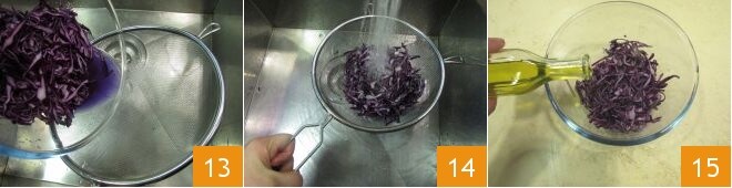 depois escorra o líquido que ele soltará 13 e enxágue em água corrente 14; este passo serve para amaciar o repolho. Transfira novamente para uma tigela e tempere com pimenta e óleo 15. Não será necessário adicionar sal.