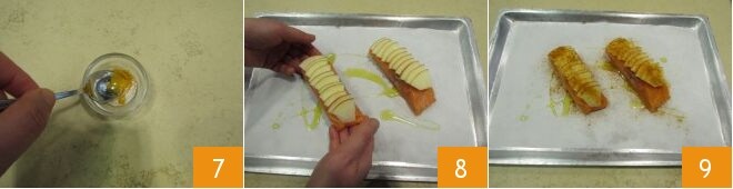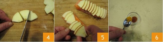 e divida cada fatia em três triângulos 4. Pegue seus filés de salmão e coloque as maçãs por cima 5. Pegue outra tigelinha e adicione a páprica e o açafrão em pó (basta a ponta de uma colher de chá de cada) 6