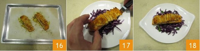 Retire os filés já cozidos e bem dourados do forno 16; coloque uma cama de repolho roxo em um prato e posicione os filés 17, decore com folhas de hortelã e sirva imediatamente 18.