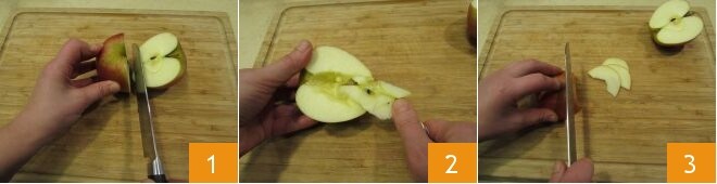 Para preparar o salmão com maçãs, comece lidando com elas. Lave-as, divida-as ao meio 1 e, usando uma faquinha, remova o miolo 2. Neste ponto, corte as maçãs em fatias não muito finas 3
