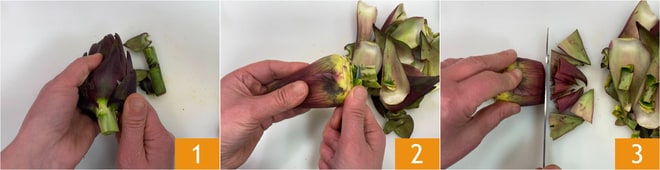 Para preparar os saltimbocca de peixe-espada com alcachofras, primeiro dedique-se à Como limpar alcachofras: remova as folhas externas mais duras 1, descasque a parte mais coriácea do talo 2, depois corte as pontas com um corte preciso 3.
