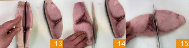 Enquanto isso, corte o filé de peixe-espada em 6 fatias com espessura de cerca de 2 cm 13. Remova a pele 14 e divida-as ao meio 15.
