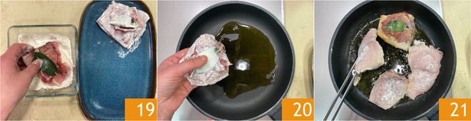 Enfarinhe os saltimbocca de ambos os lados 19. Em uma frigideira, aqueça o azeite, depois adicione os saltimbocca com o lado do presunto voltado para baixo 20 e cozinhe até dourar. Vire os saltimbocca e cozinhe por alguns instantes do outro lado também 21.