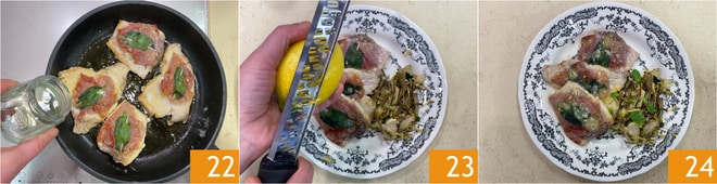 Neste ponto, refogue com vinho branco 22 e deixe evaporar completamente a parte alcoólica. Sirva no prato e complete com a casca de limão ralada 23 e algumas folhinhas de menta. Os seus saltimbocca de peixe-espada com alcachofras estão prontos para serem saboreados 24!