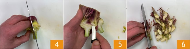 Divida as alcachofras ao meio 4 e remova o miolo interno 5, depois corte-as em tiras 6.