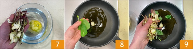 Coloque as alcachofras em água acidulada até o momento de uso 7. Em uma frigideira, adicione um fio de azeite, o alho e a menta 8 e deixe fritar por alguns minutos. Em seguida, adicione as alcachofras 9.