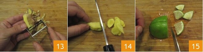 Descasque o gengibre com o descascador de legumes 13 e também corte-o em fatias finas 14. Pegue um dos limões, divida-o em quartos e corte-os em fatias finas 15 (se não gostar do sabor amargo, pode usar meio limão ou apenas algumas fatias nesta fase).