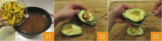Quando a sopa atingir a fervura, adicione o frango previamente salteado 31, misture, ajuste o sal, depois cubra com a tampa e continue o cozimento. Neste ponto, prepare o abacate: corte-o ao meio no sentido do comprimento, remova o caroço central com uma colher 32, depois solte a polpa da casca, cuidando para não danificá-la, sempre usando a colher 33.