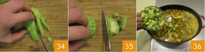 Corte a polpa do abacate primeiro em fatias 34 e depois em cubinhos 35, e adicione à sopa em cozimento 36. Recoloque a tampa e deixe a sopa cozinhar por pelo menos 50 minutos no total.