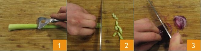Para preparar a sopa de frango e abacate, primeiro prepare todos os legumes: lave o aipo e remova os fios externos usando um descascador de legumes 1, depois corte-o em pedacinhos 2. Limpe a cebola roxa e corte-a em fatias finas 3,