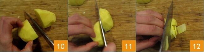 Descasque a batata e divida-a ao meio primeiro transversalmente 10, depois longitudinalmente 11, em seguida, corte-a em fatias finas 12.