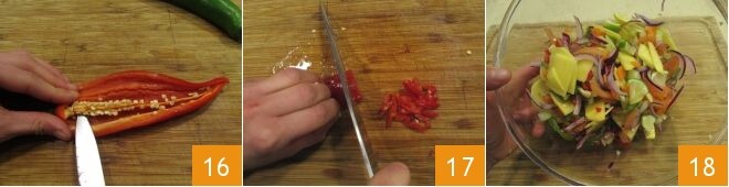 Por fim, lave a pimenta vermelha, divida-a ao meio no sentido do comprimento e remova as sementes internas 16, depois corte-a em pedacinhos 17; faça o mesmo com a pimenta verde. Junte todos esses legumes em uma tigela grande 18 e reserve.