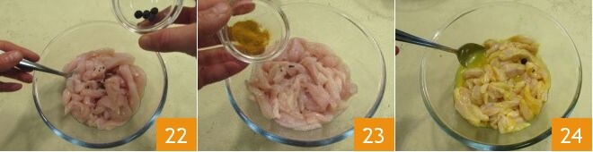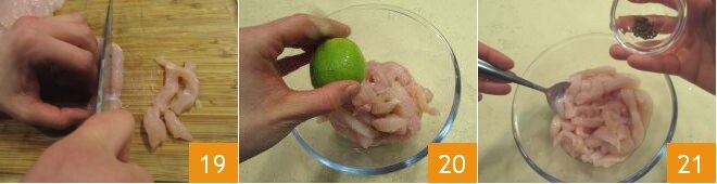 Agora você pode cuidar do frango: corte o peito de frango em tiras de espessura média 19, transfira-o para uma tigela e adicione o suco espremido dos dois limões restantes 20, os cravos-da-índia 21,