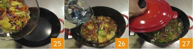 Decorrido o tempo da marinada, retire o frango da geladeira e remova as bagas de zimbro. Enquanto deixa o frango voltar à temperatura ambiente, comece a cozinhar os legumes: pegue uma caçarola grande com bordas altas, adicione a mistura de legumes preparada anteriormente 25 e coloque a água dentro até cobrir todos os ingredientes 26. Cubra com uma tampa 27 e leve à fervura em fogo médio.