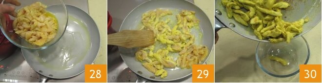 Enquanto isso, aqueça o azeite em outra panela, adicione o frango marinado 28 e salteie em fogo médio por 5-6 minutos, mexendo frequentemente 29. Uma vez pronto, transfira o frango para uma tigela e reserve momentaneamente 30.