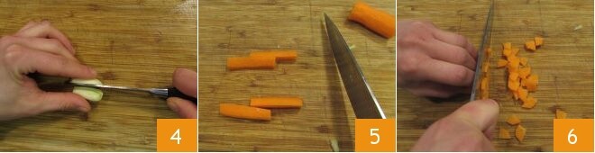 depois descasque os dentes de alho e corte-os ao meio no sentido do comprimento 4. Descasque as cenouras e corte-as primeiro em palitos 5 e depois em cubinhos 6.