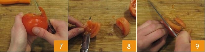 Agora pegue os tomates, remova a casca com uma faca de legumes 7, depois corte-os ao meio e remova o talo; divida as metades em gomos e remova a polpa interna com as sementes 8, depois corte-os em fatias finas 9.